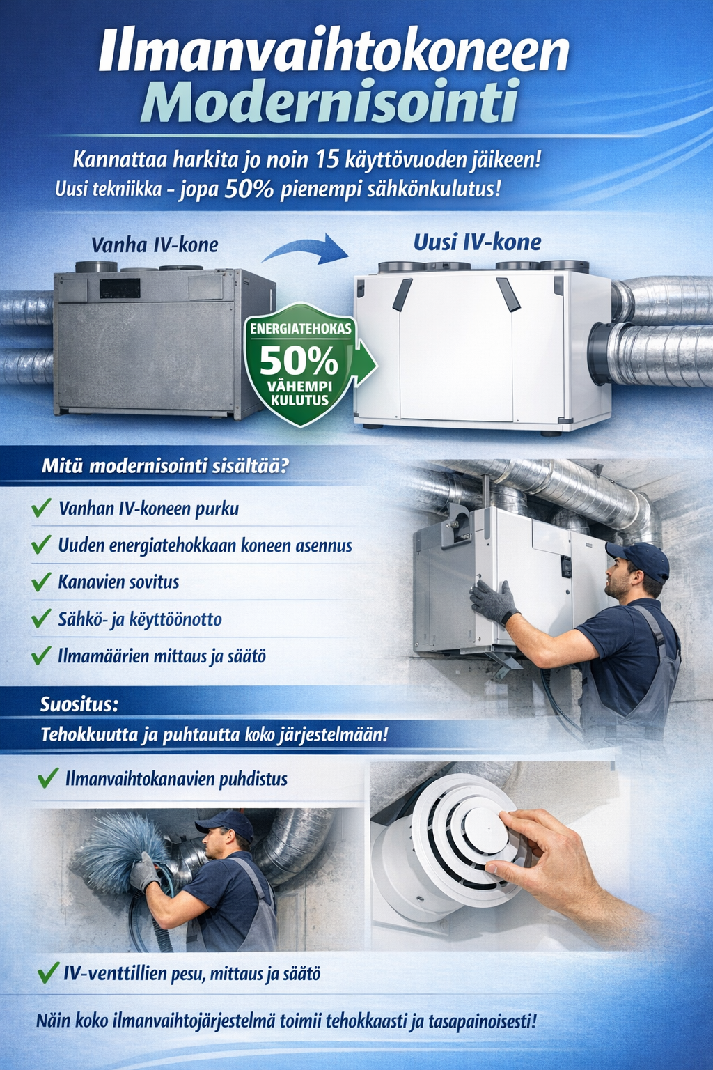 Ilmanvaihtokoneen modernisointia kannattaa harkita jo noin 15 käyttövuoden jälkeen.